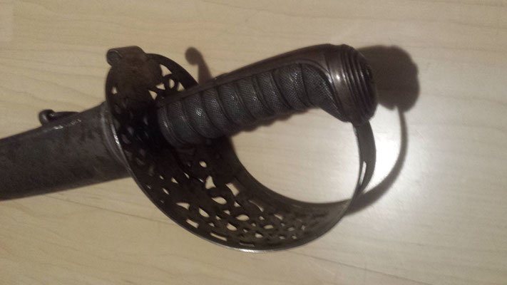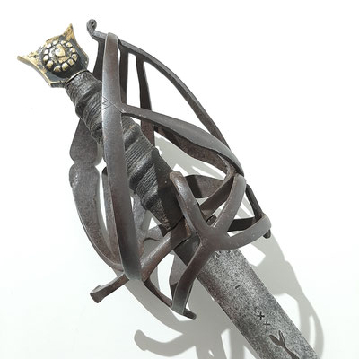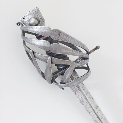 Komplexes Korbgefäß aus Metallbändern zum Schutz der Hand