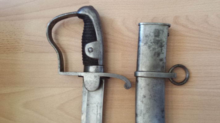 (Foto einer M1927 Schaschka mit ergänztem Ortblech an der Scheide! Das Mosin Nagat Bajonett ist vor 1930 gefertigt da es keinen Druckknopf besitzt)